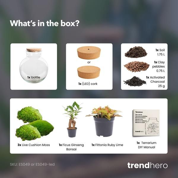 Het terrarium vraagt minimaal onderhoud. Water geven is vaak slechts één tot twee keer per jaar nodig. Perfect voor in de woonkamer, op kantoor, in de slaapkamer of als origineel cadeau. Binnen enkele minuten bouw je jouw eigen mini-ecosysteem op en geniet je langdurig van levendig groen, zonder gedoe.