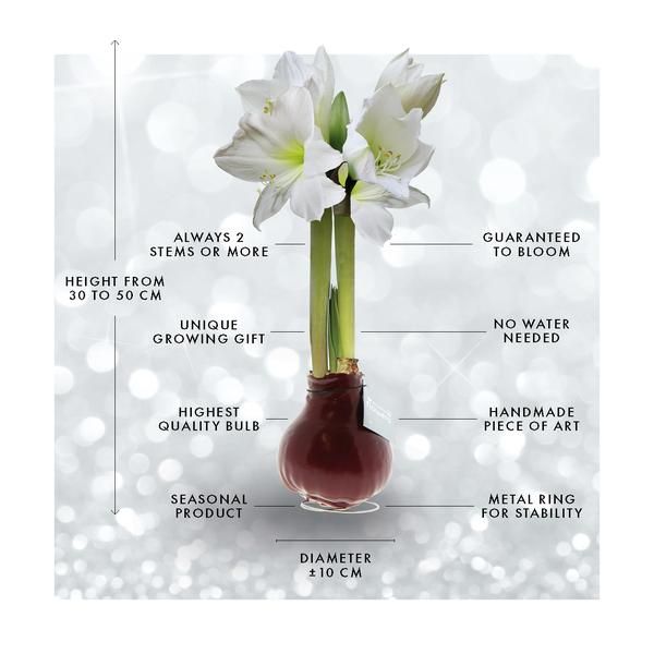 p style= margin-top:0cm margin-right:0cm margin-bottom:8.0pt margin-left:0cm font-size:11.0pt font-family: Aptos sans-serif Deze zorgvuldig gekozen en rigoureus geteste bloembollen bloeien en groeien zonder enige waterbehoefte. Elk jaar selecteren wij met grote zorg de beste amaryllis-varië teiten om de uitmuntendheid en bloei van onze No Water Flowers® te waarborgen. Bloembollen zijn natuurlijke producten en hebben van nature unieke vormen daarom is geen enkele No Water Flowers® hetzelfde. Elke amaryllisbol die gebruikt wordt voor de No Water Flowers® ondergaat een handmatige behandeling en wordt vervolgens zorgvuldig gewaxed om perfectie te bereiken. /p
